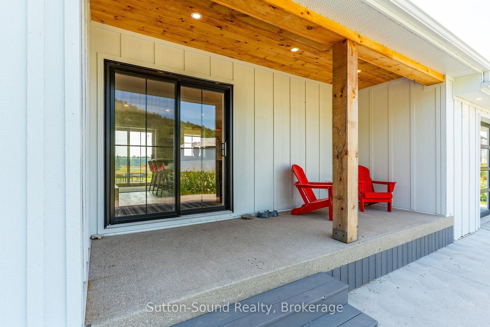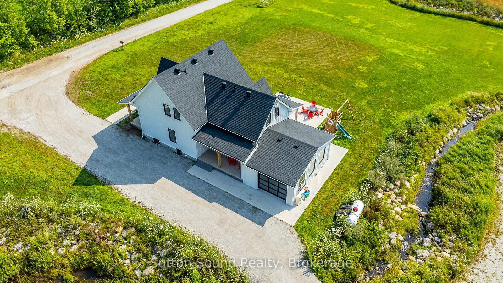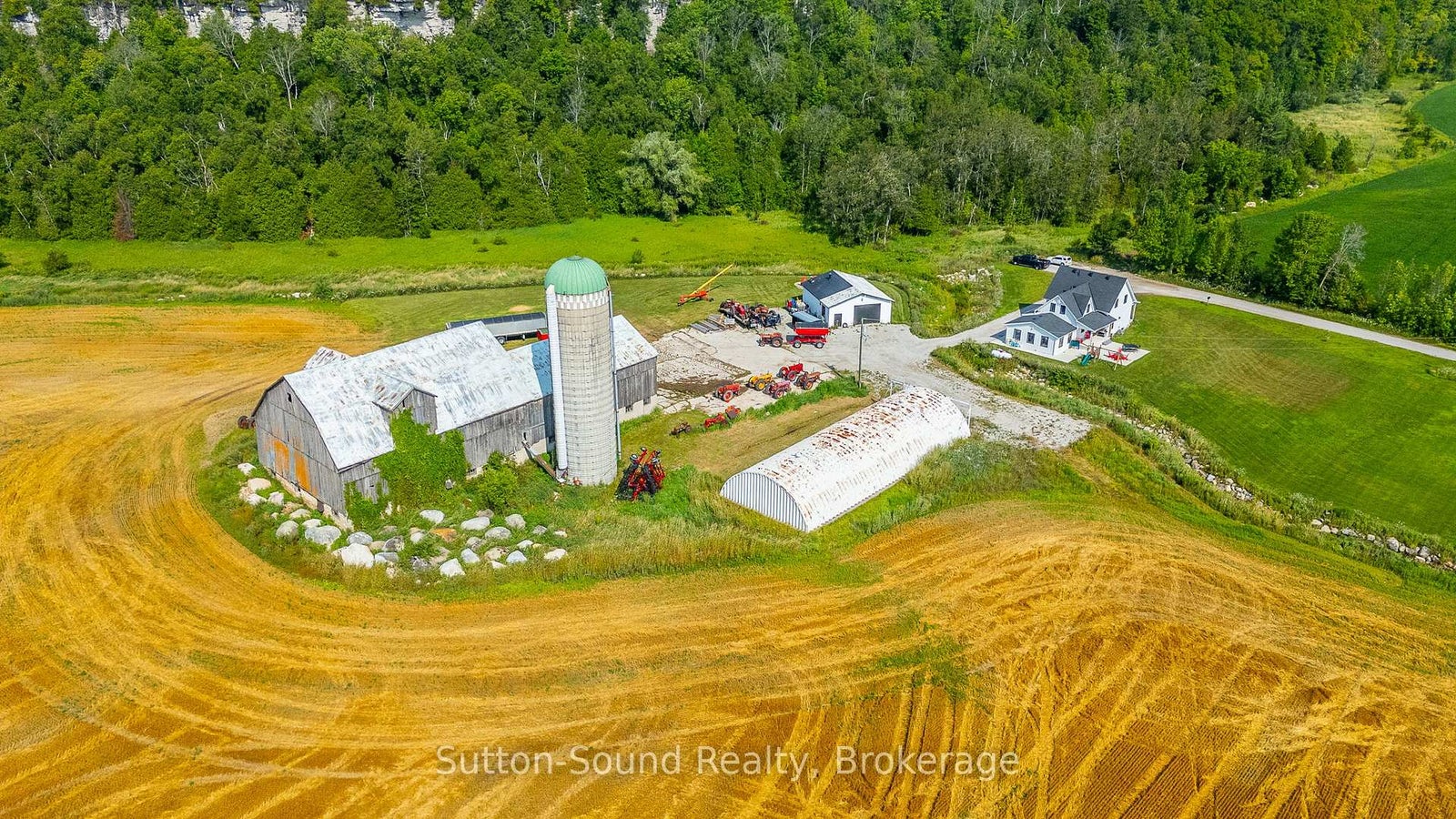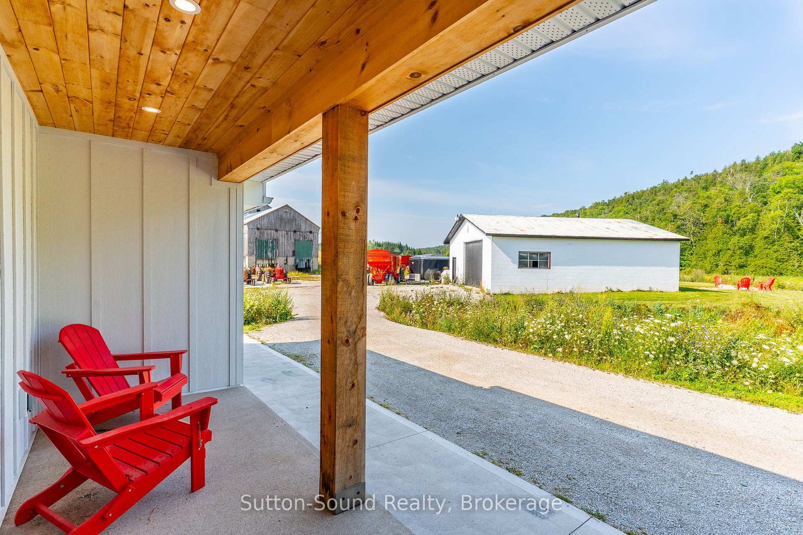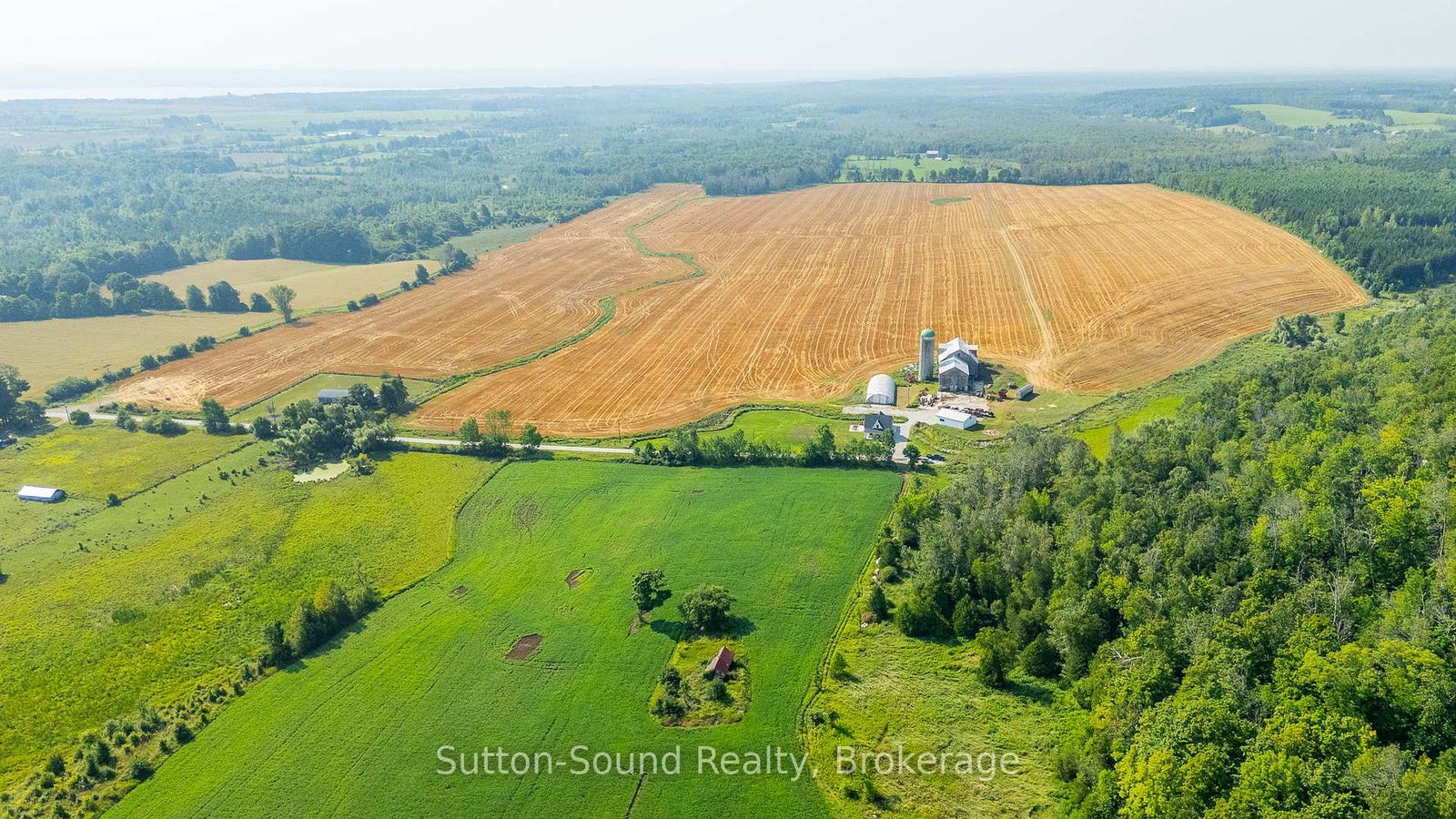 This exceptional 149-acre farm is privately set at the end of a quiet dead end road, bordered by the dramatic backdrop of the Niagara Escarpment and offering sweeping views of the countryside. With approximately 143 workable acres, the land is open, fertile, and has been systematically tiled as needed, with fence lines removed to enhance usability and flow.The original 1870 farmhouse has been completely renovated into a warm, modern home. It features forced-air propane heating, central air, and hot water on demand. The kitchen is designed for gathering, with a large island that seats six and patio doors leading to the large side deck that flood the space with natural light and frame the beautiful landscape. Character details like deep window sills and a natural stone propane fireplace create an inviting main floor, which also includes a stylish two-piece powder room. Upstairs are three bright bedrooms, a four-piece bath with soaker tub and glass shower, and a spacious laundry room with a utility sink. The large primary bedroom offers stunning views overlooking the land. The attached garage is a functional and stylish extension of the home, with a glass overhead door, large windows, and a finished concrete floor. The basement is dry, insulated with spray foam, and features a concrete floor, updated mechanical systems, and ample storage.Outdoor living is enhanced by covered verandahs, patios, a propane fire table, and a peaceful, stone-lined year-round creek. Outbuildings include a towering bank barn suitable for livestock or horses, a 38x100 ft Quonset hut, and a 32x40 ft detached garage. Located near the Bruce Trail, scenic lookouts, and snowmobile/ATV routes, and just a short drive to both Wiarton and Owen Sound, this is a rare opportunity to enjoy rural living at its finest.