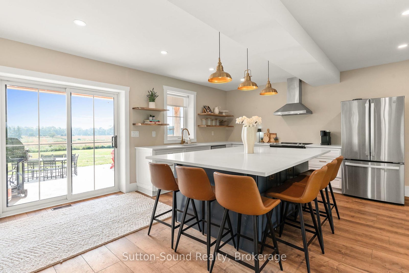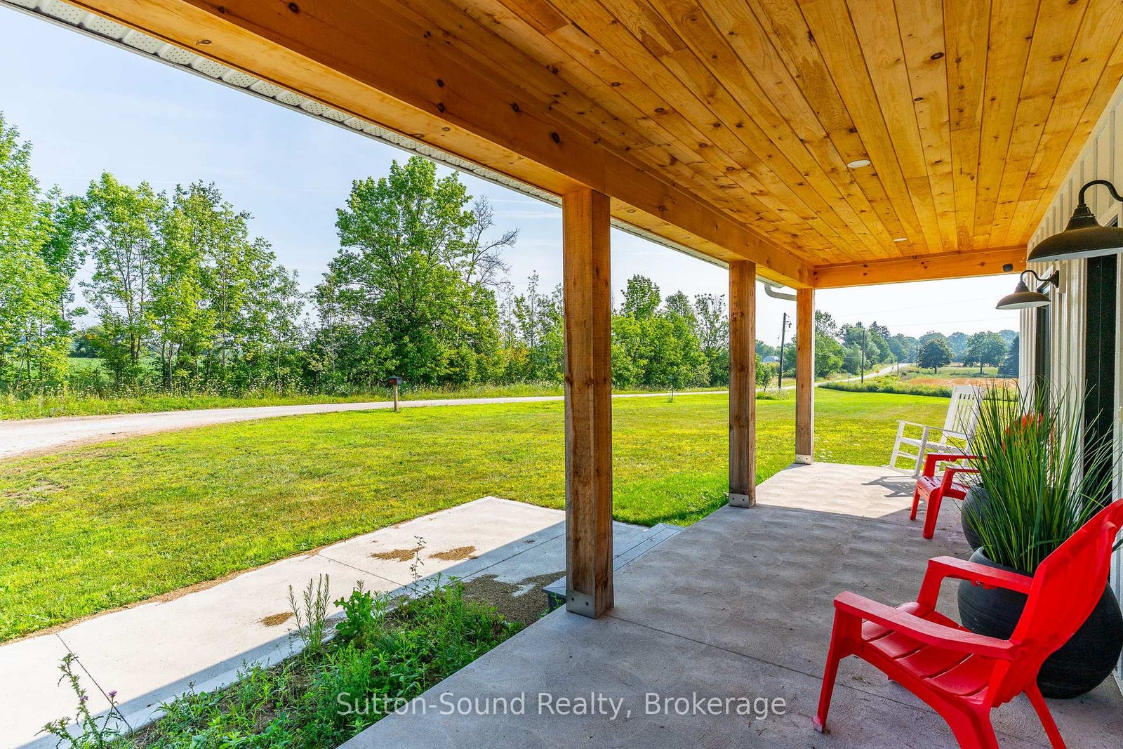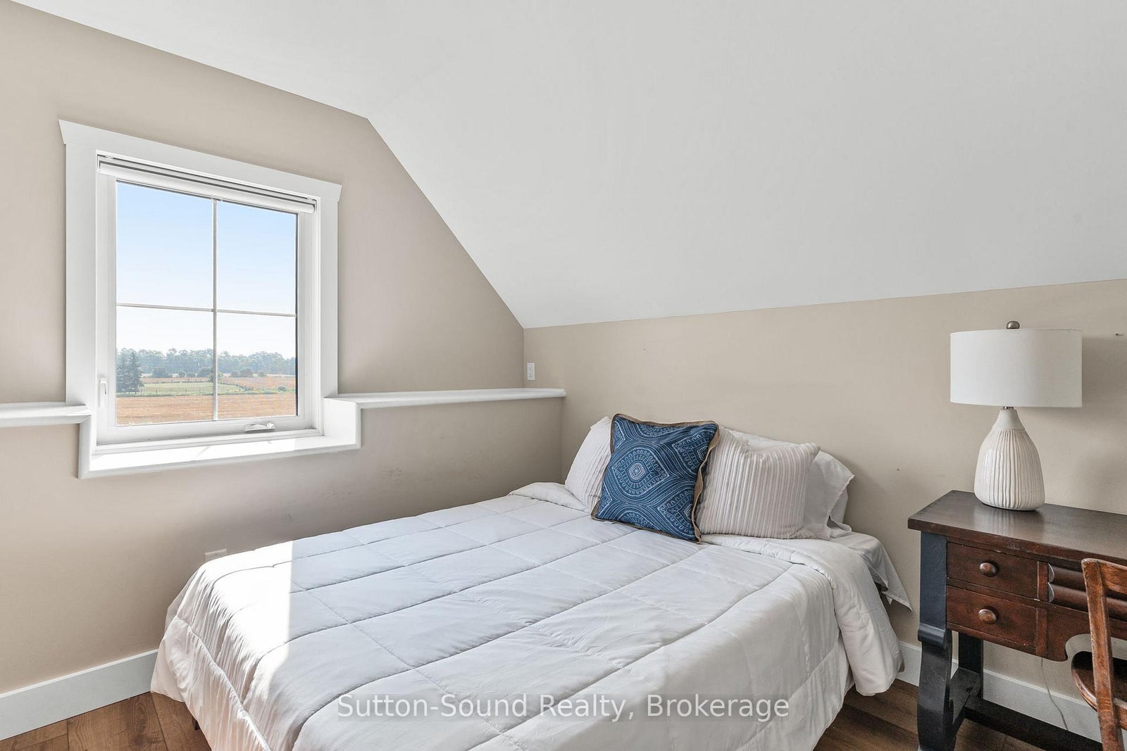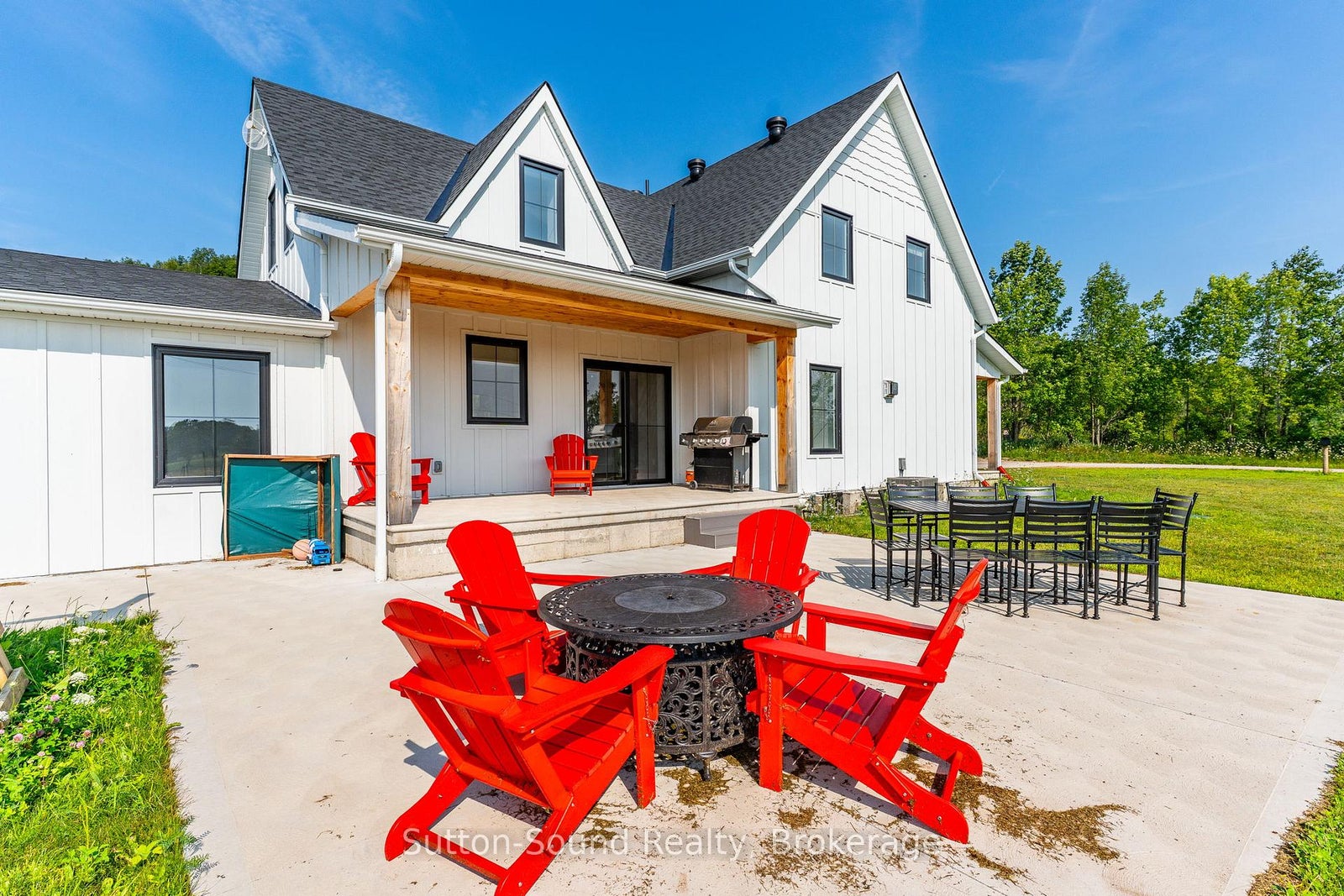 This exceptional 149-acre farm is privately set at the end of a quiet dead end road, bordered by the dramatic backdrop of the Niagara Escarpment and offering sweeping views of the countryside. With approximately 143 workable acres, the land is open, fertile, and has been systematically tiled as needed, with fence lines removed to enhance usability and flow.The original 1870 farmhouse has been completely renovated into a warm, modern home. It features forced-air propane heating, central air, and hot water on demand. The kitchen is designed for gathering, with a large island that seats six and patio doors leading to the large side deck that flood the space with natural light and frame the beautiful landscape. Character details like deep window sills and a natural stone propane fireplace create an inviting main floor, which also includes a stylish two-piece powder room. Upstairs are three bright bedrooms, a four-piece bath with soaker tub and glass shower, and a spacious laundry room with a utility sink. The large primary bedroom offers stunning views overlooking the land. The attached garage is a functional and stylish extension of the home, with a glass overhead door, large windows, and a finished concrete floor. The basement is dry, insulated with spray foam, and features a concrete floor, updated mechanical systems, and ample storage.Outdoor living is enhanced by covered verandahs, patios, a propane fire table, and a peaceful, stone-lined year-round creek. Outbuildings include a towering bank barn suitable for livestock or horses, a 38x100 ft Quonset hut, and a 32x40 ft detached garage. Located near the Bruce Trail, scenic lookouts, and snowmobile/ATV routes, and just a short drive to both Wiarton and Owen Sound, this is a rare opportunity to enjoy rural living at its finest.
