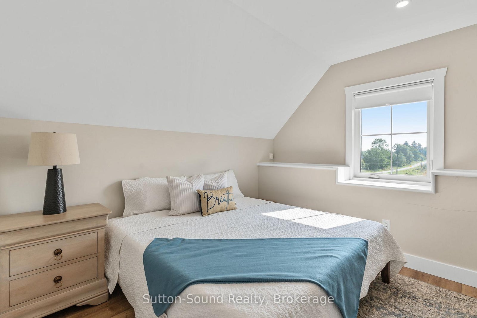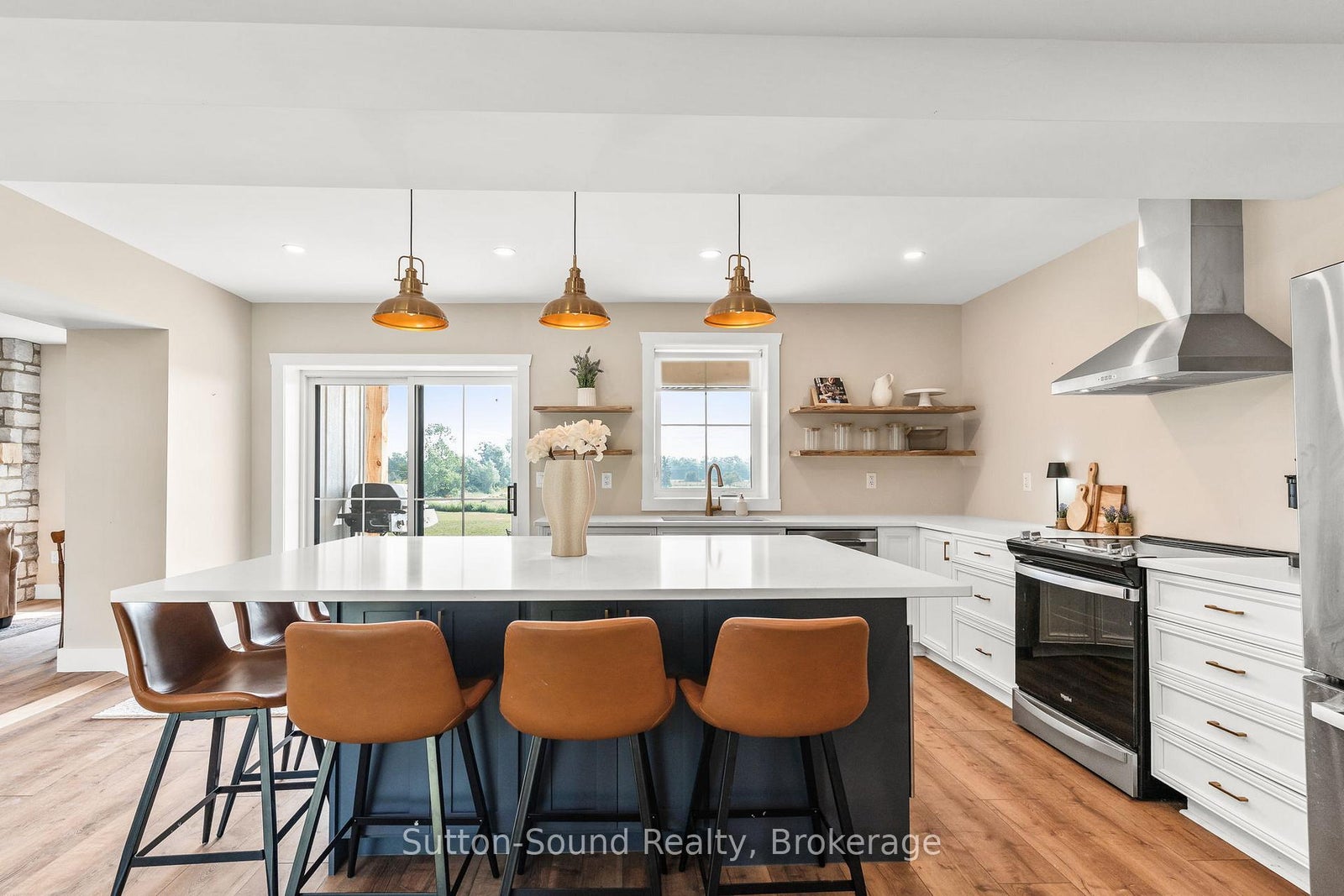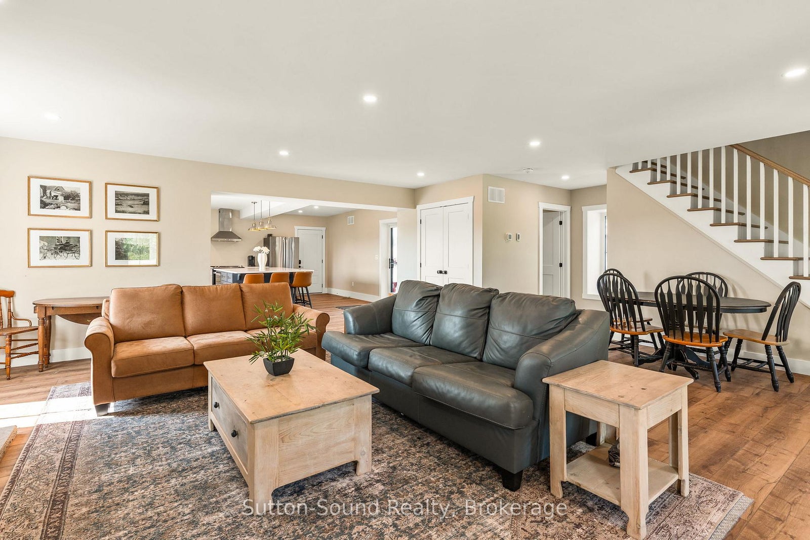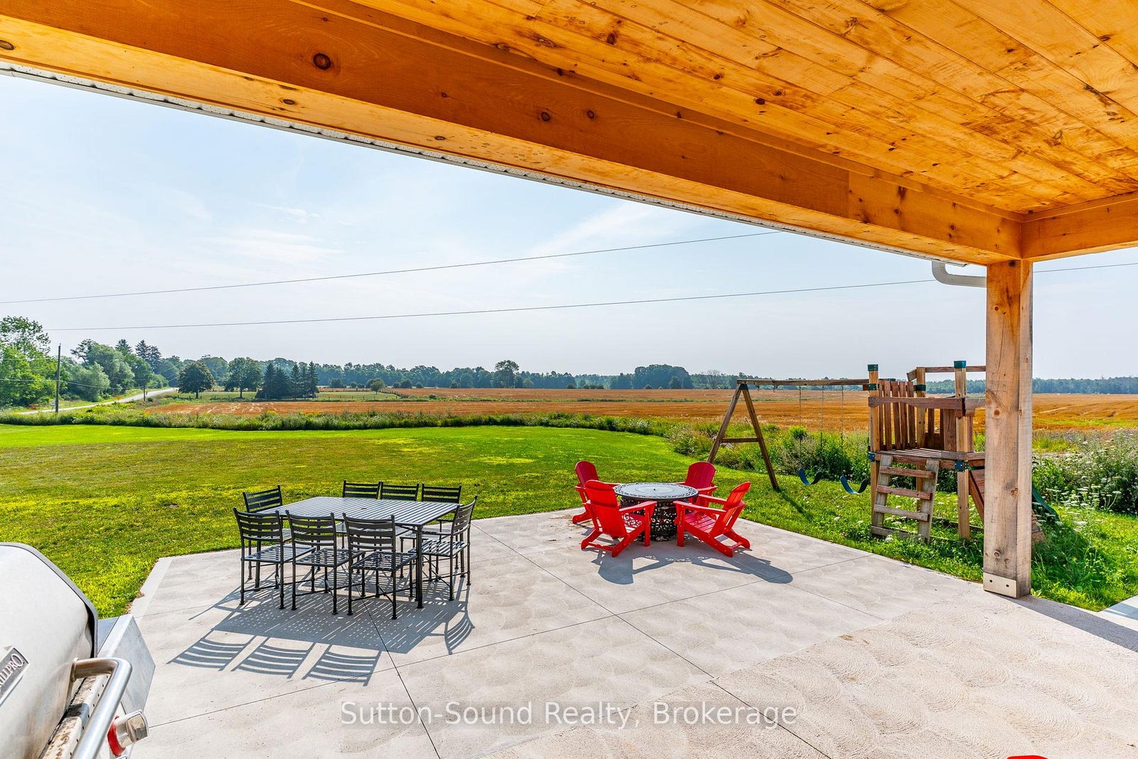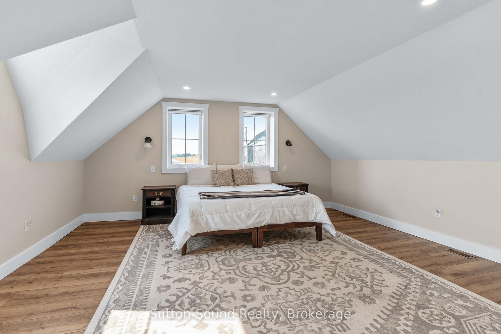 This exceptional 149-acre farm is privately set at the end of a quiet dead end road, bordered by the dramatic backdrop of the Niagara Escarpment and offering sweeping views of the countryside. With approximately 143 workable acres, the land is open, fertile, and has been systematically tiled as needed, with fence lines removed to enhance usability and flow.The original 1870 farmhouse has been completely renovated into a warm, modern home. It features forced-air propane heating, central air, and hot water on demand. The kitchen is designed for gathering, with a large island that seats six and patio doors leading to the large side deck that flood the space with natural light and frame the beautiful landscape. Character details like deep window sills and a natural stone propane fireplace create an inviting main floor, which also includes a stylish two-piece powder room. Upstairs are three bright bedrooms, a four-piece bath with soaker tub and glass shower, and a spacious laundry room with a utility sink. The large primary bedroom offers stunning views overlooking the land. The attached garage is a functional and stylish extension of the home, with a glass overhead door, large windows, and a finished concrete floor. The basement is dry, insulated with spray foam, and features a concrete floor, updated mechanical systems, and ample storage.Outdoor living is enhanced by covered verandahs, patios, a propane fire table, and a peaceful, stone-lined year-round creek. Outbuildings include a towering bank barn suitable for livestock or horses, a 38x100 ft Quonset hut, and a 32x40 ft detached garage. Located near the Bruce Trail, scenic lookouts, and snowmobile/ATV routes, and just a short drive to both Wiarton and Owen Sound, this is a rare opportunity to enjoy rural living at its finest.